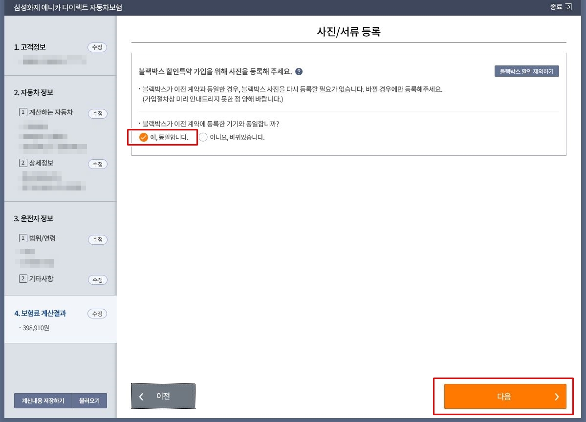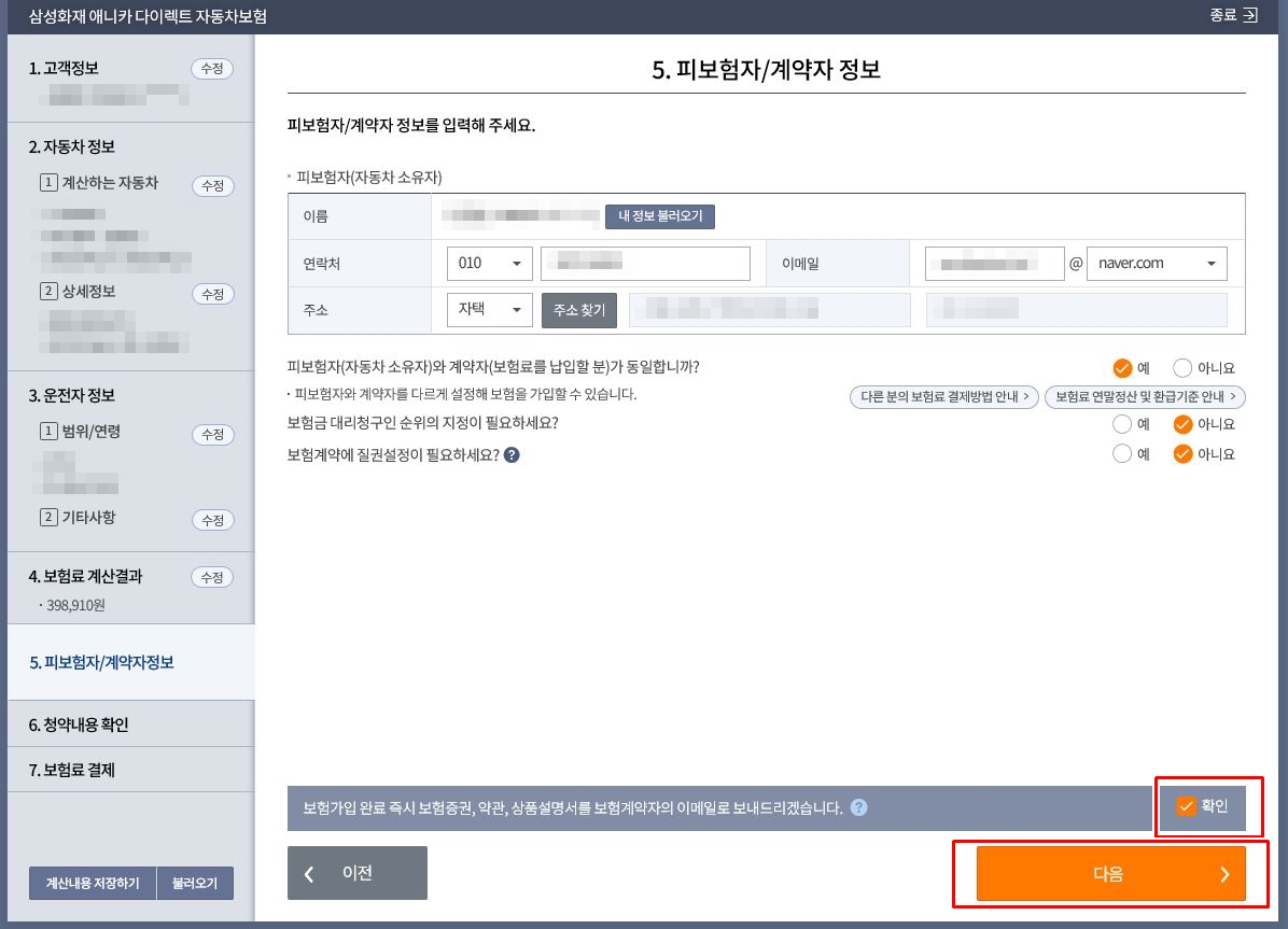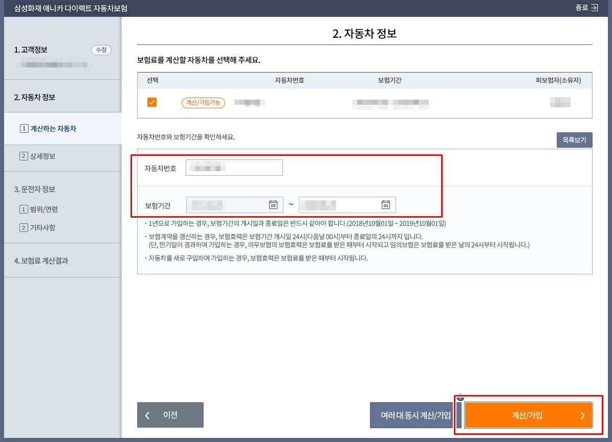 그럼 자동차번호와 보험기간을 확인하고 다음으로 넘어가면 됩니다.