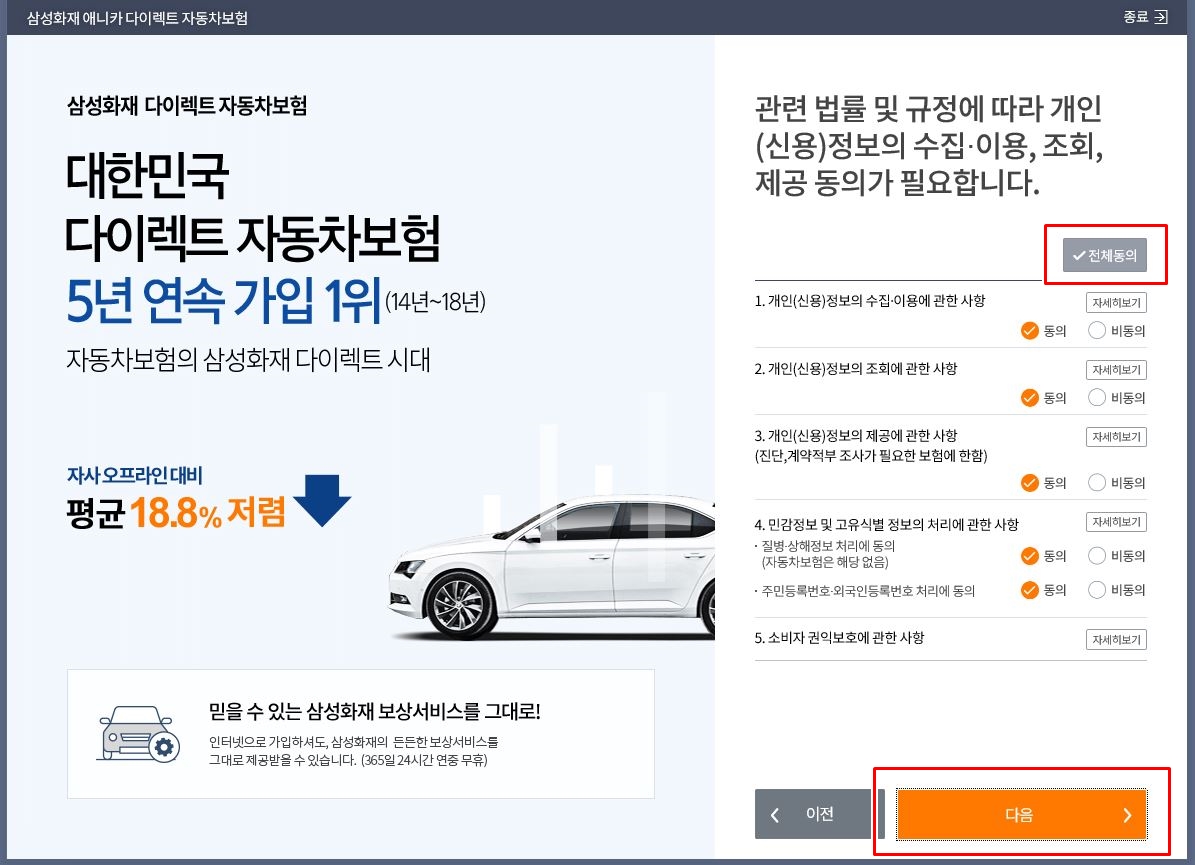 그러면 아래와 같이 삼성화재 다이렉트 자동차보험 팝업창이 하나 뜹니다.