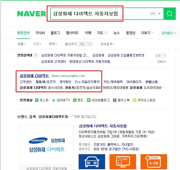 먼저 검색창에 '삼성화재 다이렉트 자동차보험' 이라고 검색을 합니다.