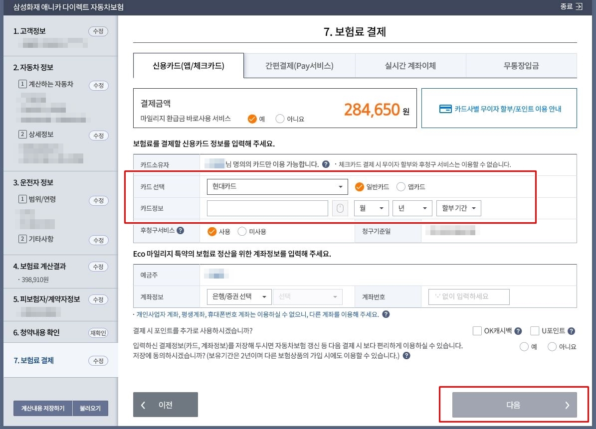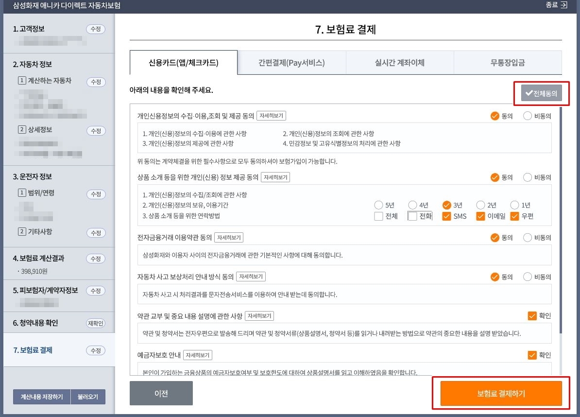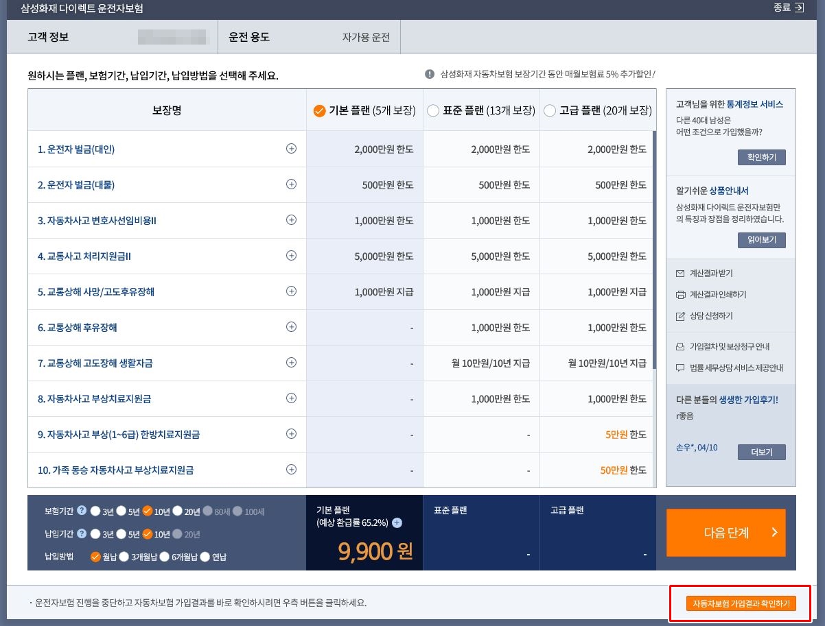 이제 보험료를 확인하고, 결제를 하면 됩니다.