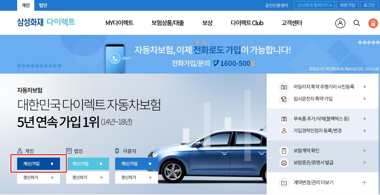 삼성화재 다이렉트 홈페이지가 열리면 좌측에 보시면 자동차보험 '계산/가입' 버튼이 있습니다.