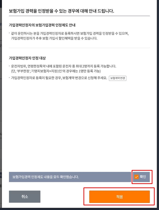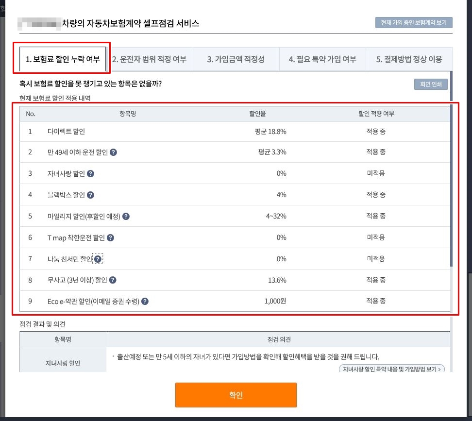1번 '보험료 할인 누락 여부'는 할인 받을수 있는 모든 항목을 표시해 주고, 적용한 것과 미적용 한것을 한눈에 볼수 있습니다. 혹시 내가 빠트린 할인인 있는지? 확인할수 있어서 좋은거 같습니다.