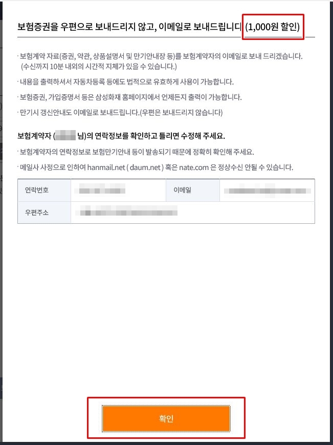 보험증권을 우편으로 받지 않고, 이메일로 받으면 1,000원 할인이 된다고 하네요~