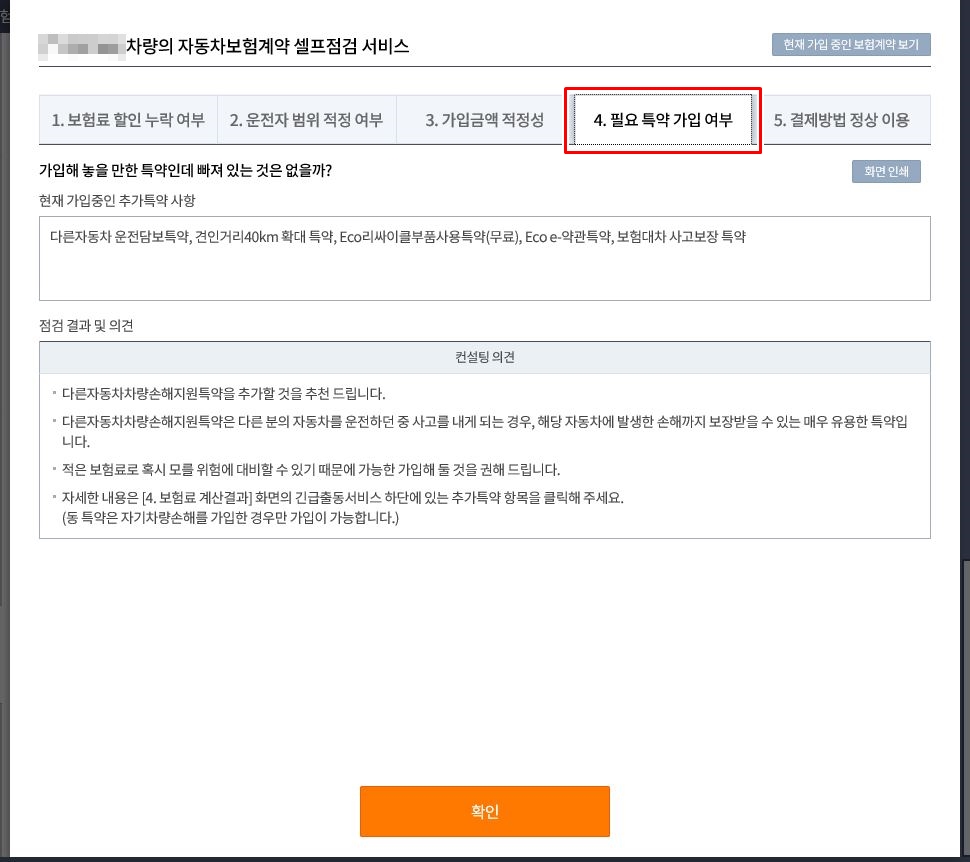 다음은 4번 '필요 특약 가입 여부' 페이지 인데, 필요한 특약을 안내해 주는거 같습니다.