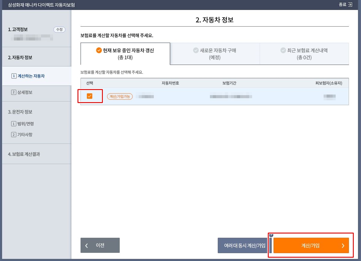 자동차 정보를 선택하고 '계산/가입' 버튼을 클릭해 주세요~