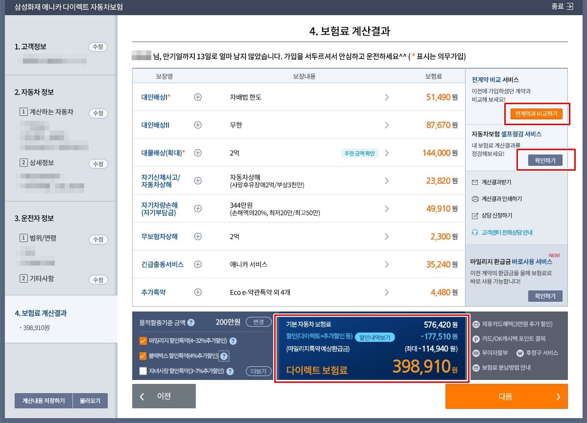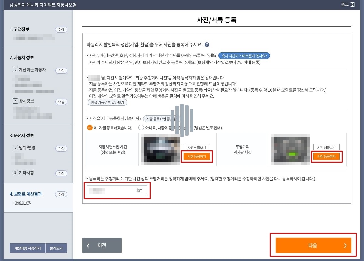 삼성화재 다이렉트 자동차보험 가입방법 - 주행거리 할인 받음