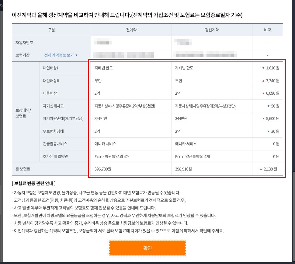 여기서 좋은점이 우측에 보시면 '전계약과 비교하기' 버튼은 있는 작년도 계약과 항목을 비교해 볼수 있습니다.