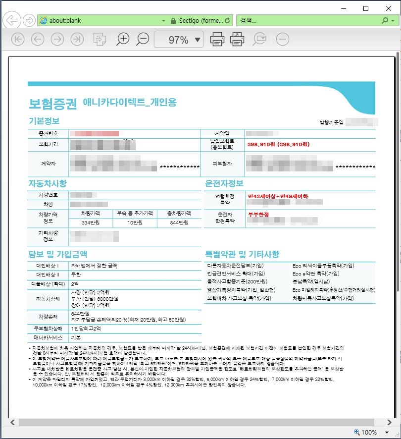 아래처럼 보험증권을 확인하고, 프린트로 출력을 했습니다.