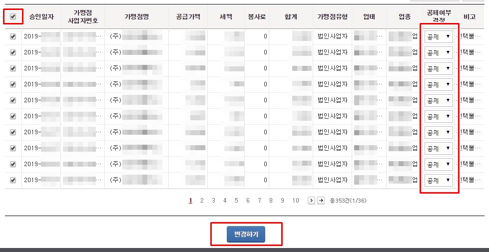 공제여부 값을 변경하고, 하단에 있는 '변경하기' 버튼을 클릭하시면 됩니다.