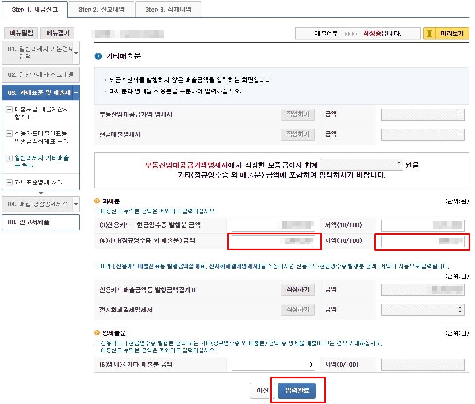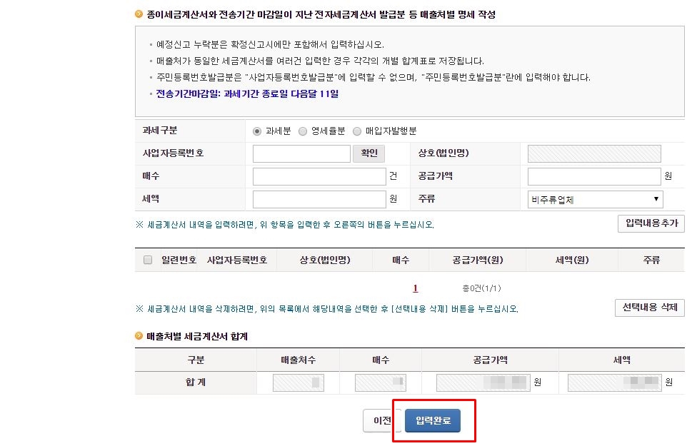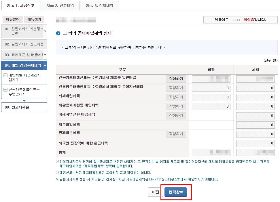 현금영수증과 사업용신용카드 부분에 건수와 공급가액, 세액을 모두 입력 하셨다면, '입력완료' 버튼을 클릭합니다.