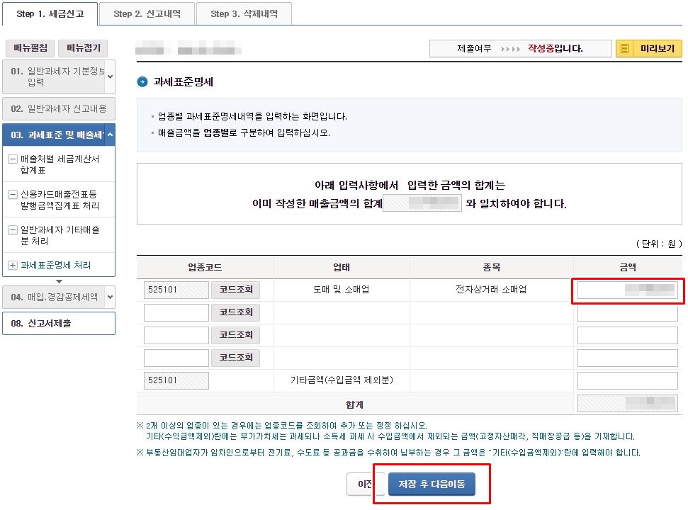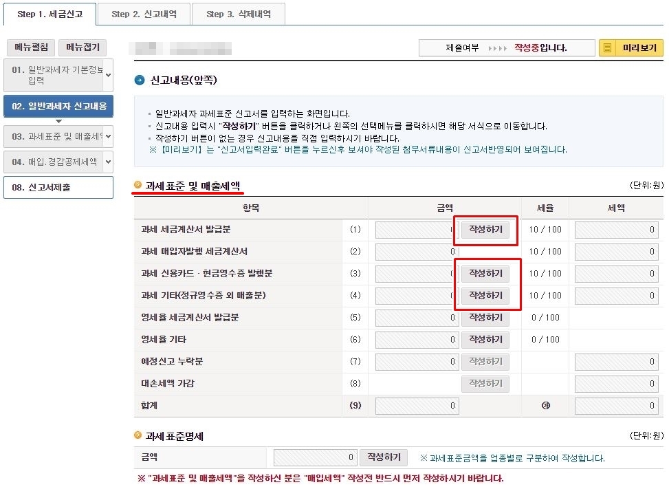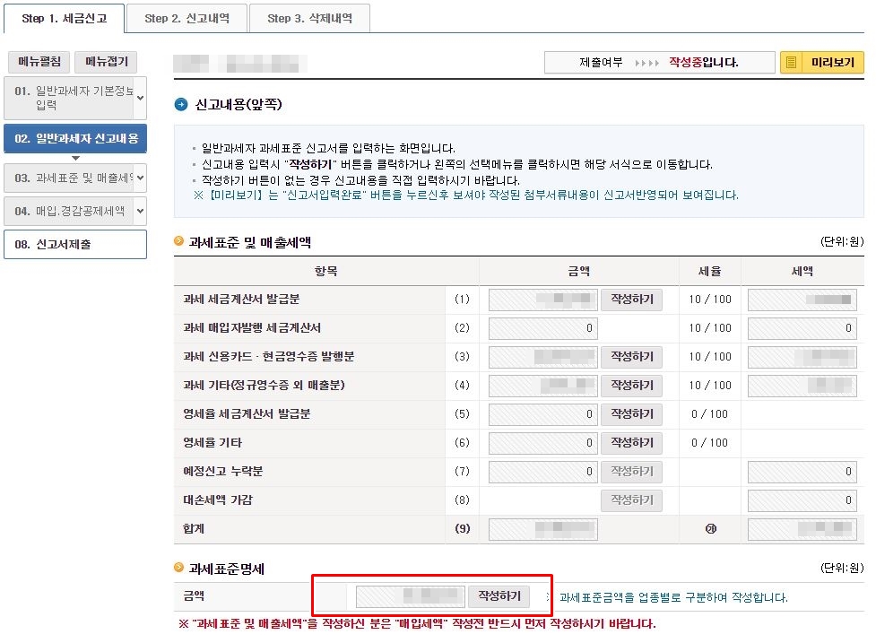 매출세액을 모두 입력하셨으면, 하단에 있는 과세표준명세를 입력해 주셔야 합니다.