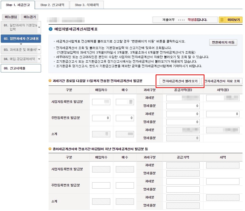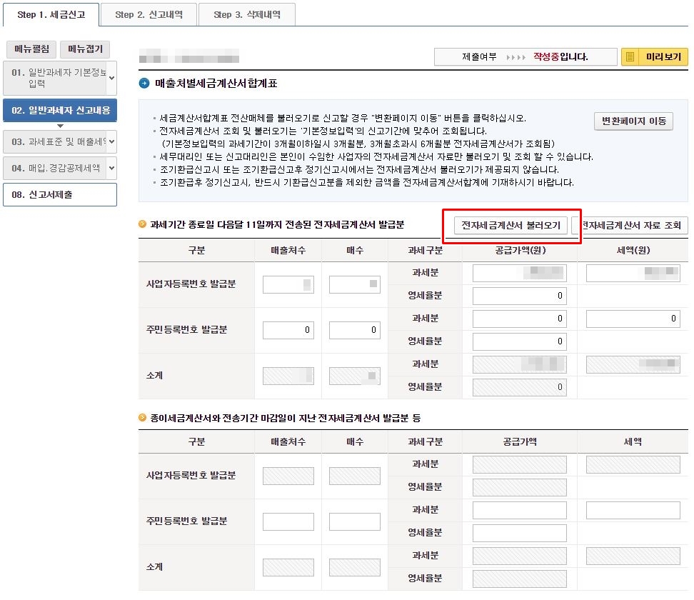 여기서도 중간에 '전자세금계산서 불러오기' 버튼을 클릭하여 자동으로 입력해 주시면 됩니다.