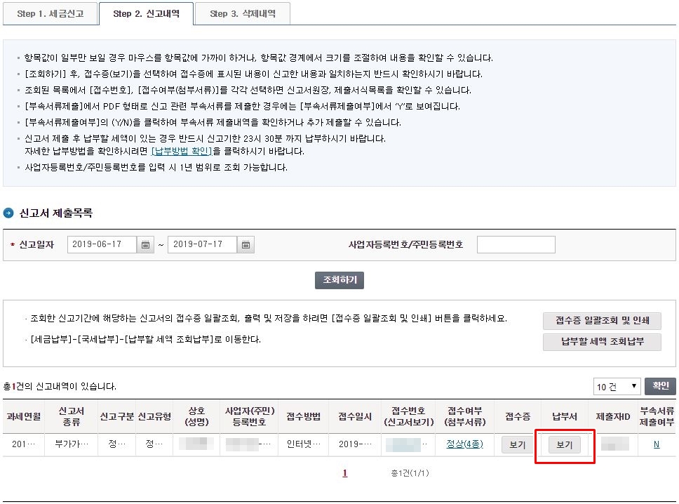 그럼 아래와 같이 방금 부가세 신고한 내역을 확인하실 수 있습니다.