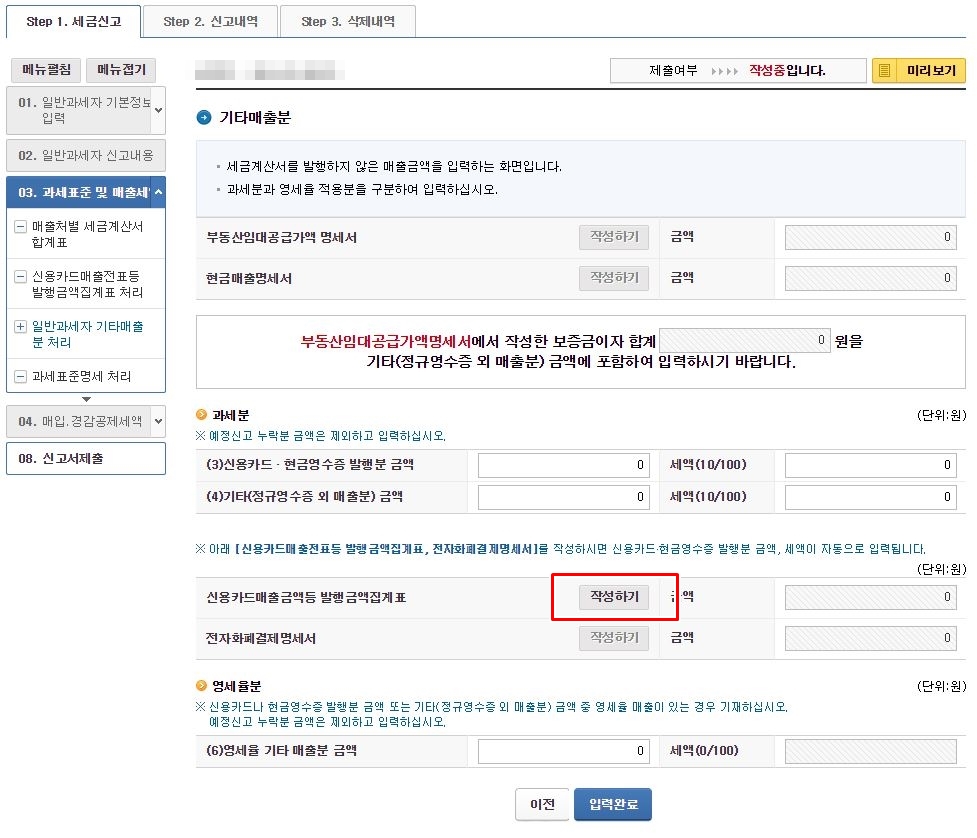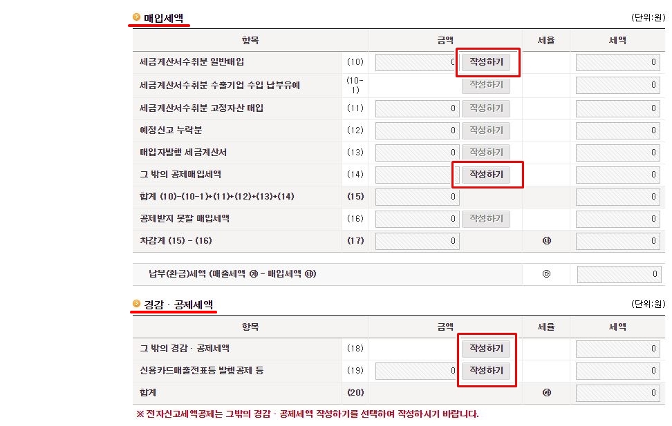 그 밖의 경감,공제세액과 신용카드 매출전표등 발행공제 등 항목의 '작성하기' 버튼을 각각 클릭해서 입력하시면 됩니다.
