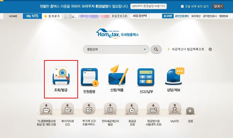 아래처럼 '조회/발급' 메뉴를 클릭하겠습니다.