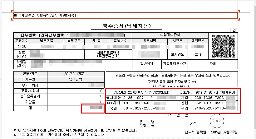 아래 화면처럼 납부금액과 가상계좌를 확인하고, 본인이 원하는 은행을 골라 입금을 하시면 부가세 납부도 완료가 됩니다.