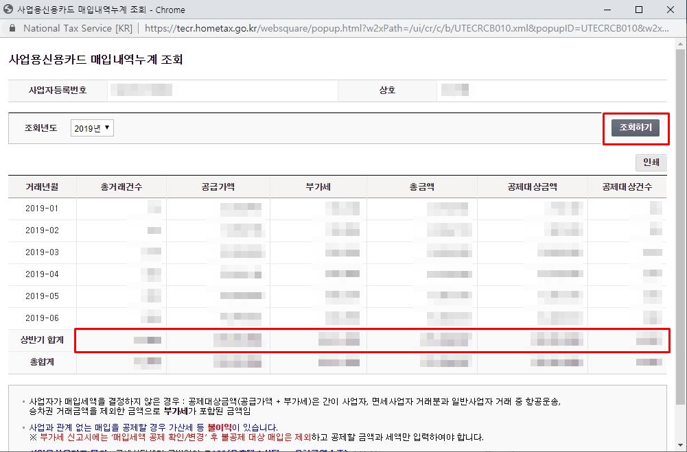 아래는 사업용신용카드 매입내역누계 조회 페이지 입니다.