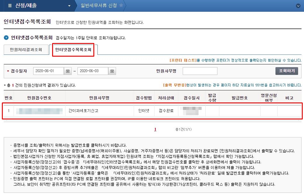 신청을 완료하면, 아래와 같이 '인터넷접수목록조회' 메뉴에서 '접수완료'된 내역을 확인할수 있습니다.