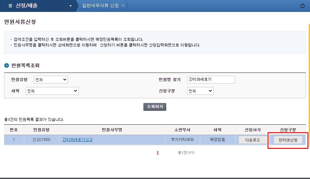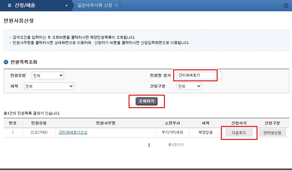 민원명 찾기에 '간이과세포기' 라고 입력하고 '조회하기' 버튼을 클릭합니다.