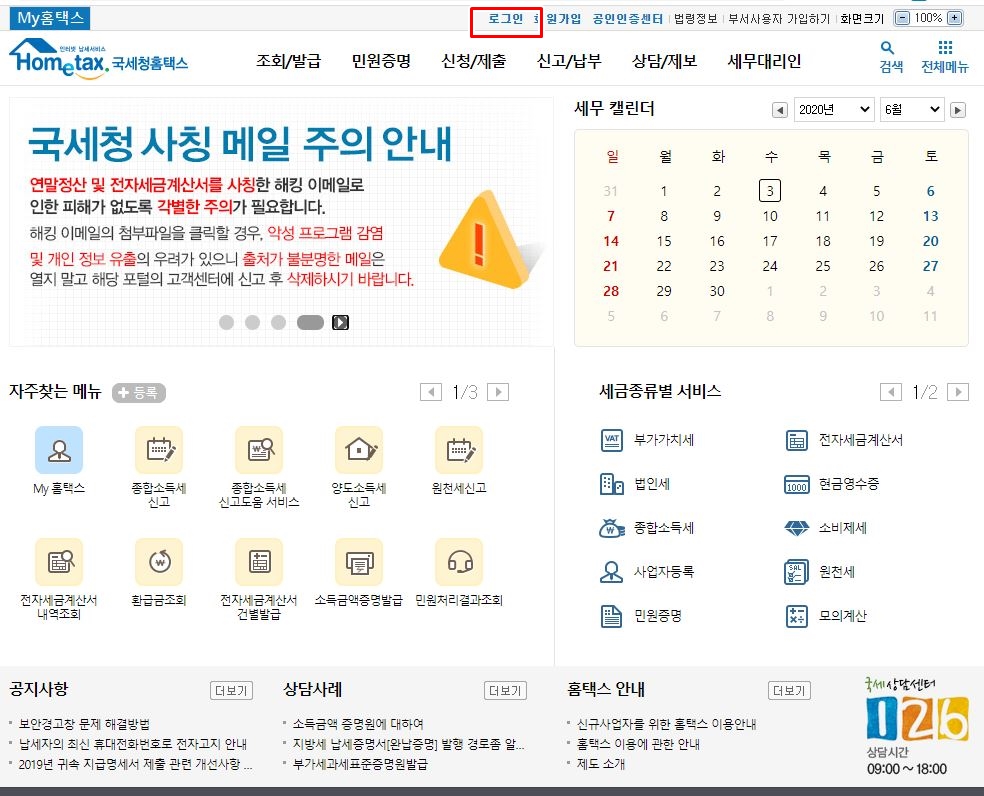먼저 간이과세 포기신고서 신청을 위해서 인터넷 홈택스 홈페이지에 접속을 합니다.