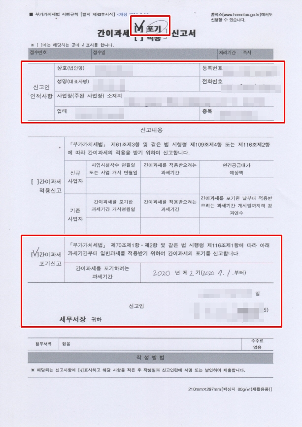 간이과세포기신고서는 6월 30일까지 제출해야 하며, 제출하지 않으면 간이과세자로 전환이 됩니다.