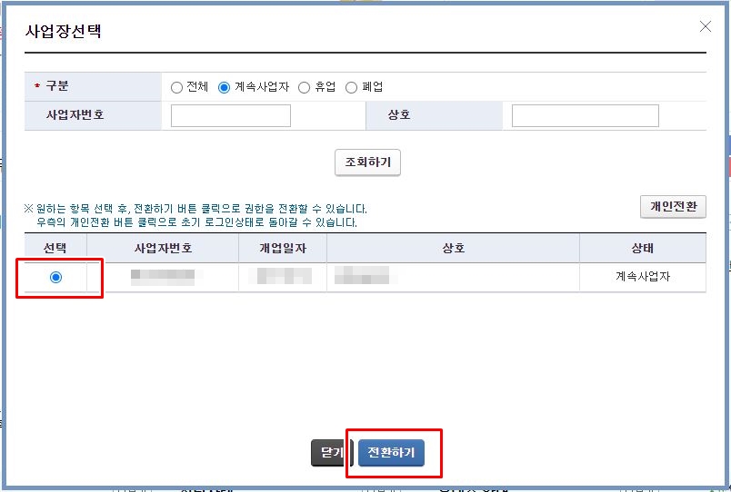 사업자가 여러개면 여러개가 뜰겁니다. 여기서 간이과세 포기신고서를 제출할 사업자를 선택하고, '전환하기' 버튼을 클릭 합니다.
