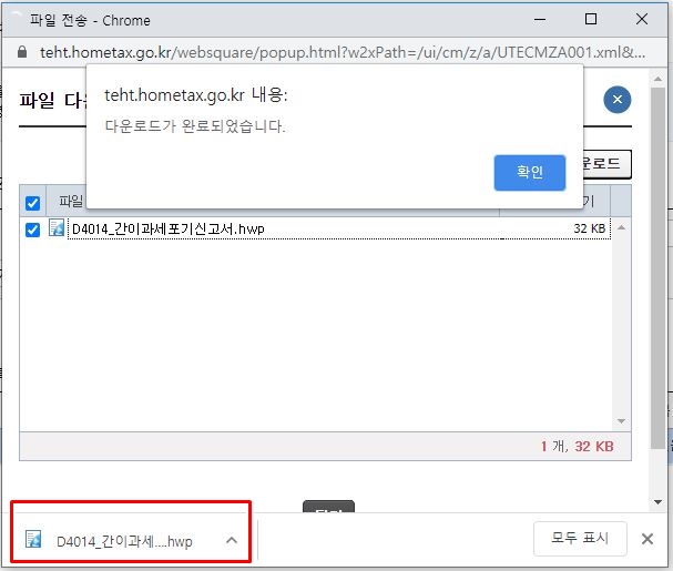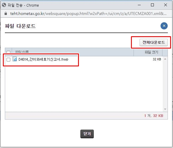 다운로드 버튼을 클릭하면, 아래처럼 팝업창이 하나 뜨는데, '간이과세포기신고서' 항목을 체크하고 '전체다운로드' 버튼을 클릭 합니다.