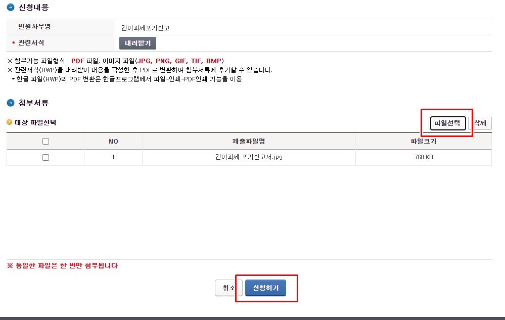 여기서 하단에 '파일선택' 버튼을 클릭하여, 좀 전에 작성하여 스캔해둔 이미지 파일을 선택하여 업로드 하시면 됩니다.