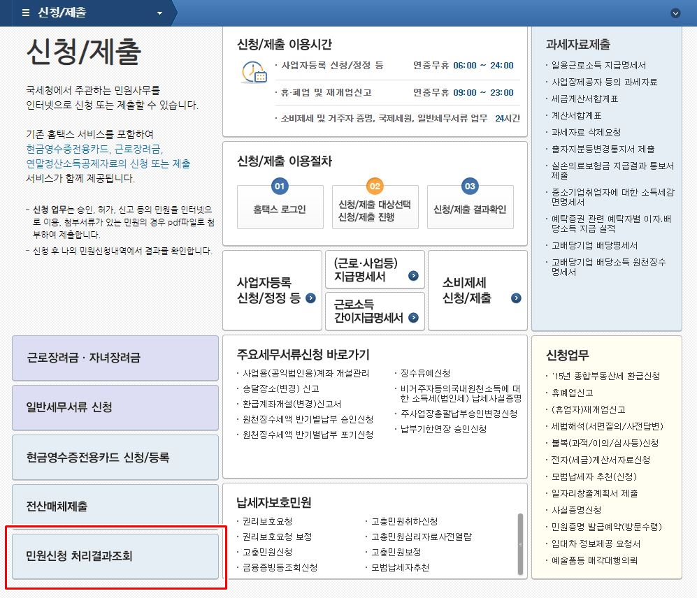 확인 하실때는 아까 신청/제출 화면에서 좌측 하단에 있는 '민원신청 처리결과조회' 메뉴를 클릭하시면 확인이 가능합니다.